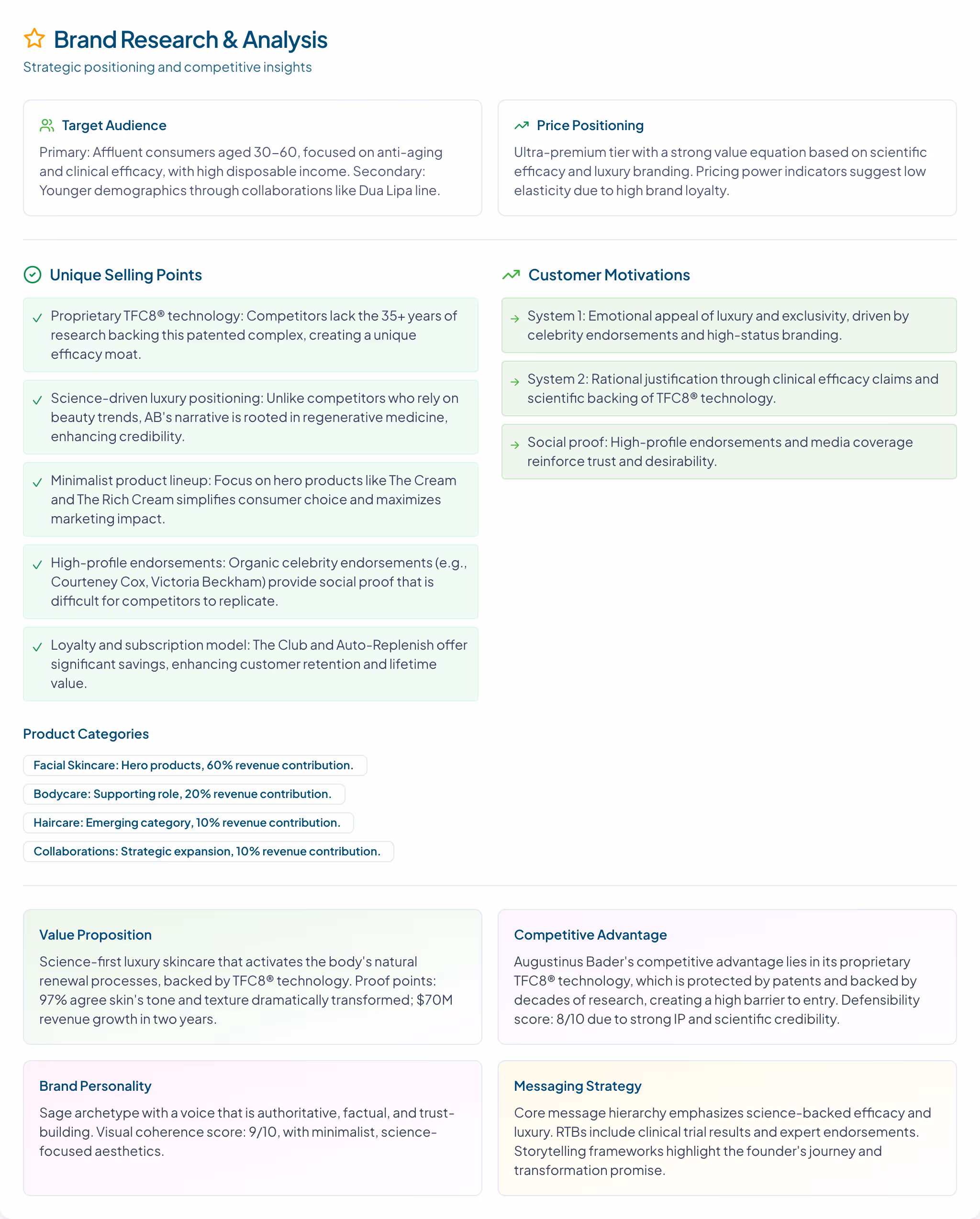 To understand Augustinus Bader’s modern advantage, you have to start with the brand’s foundational bet: credibility over cosmetics. AB sits squarely in science-first luxury skincare, anchored by its proprietary TFC8® technology and a narrative rooted in regenerative medicine. Our analysis reinforces that this positioning remains the brand’s most defensible moat, supported by strong IP and a consistent message across product architecture and content.
