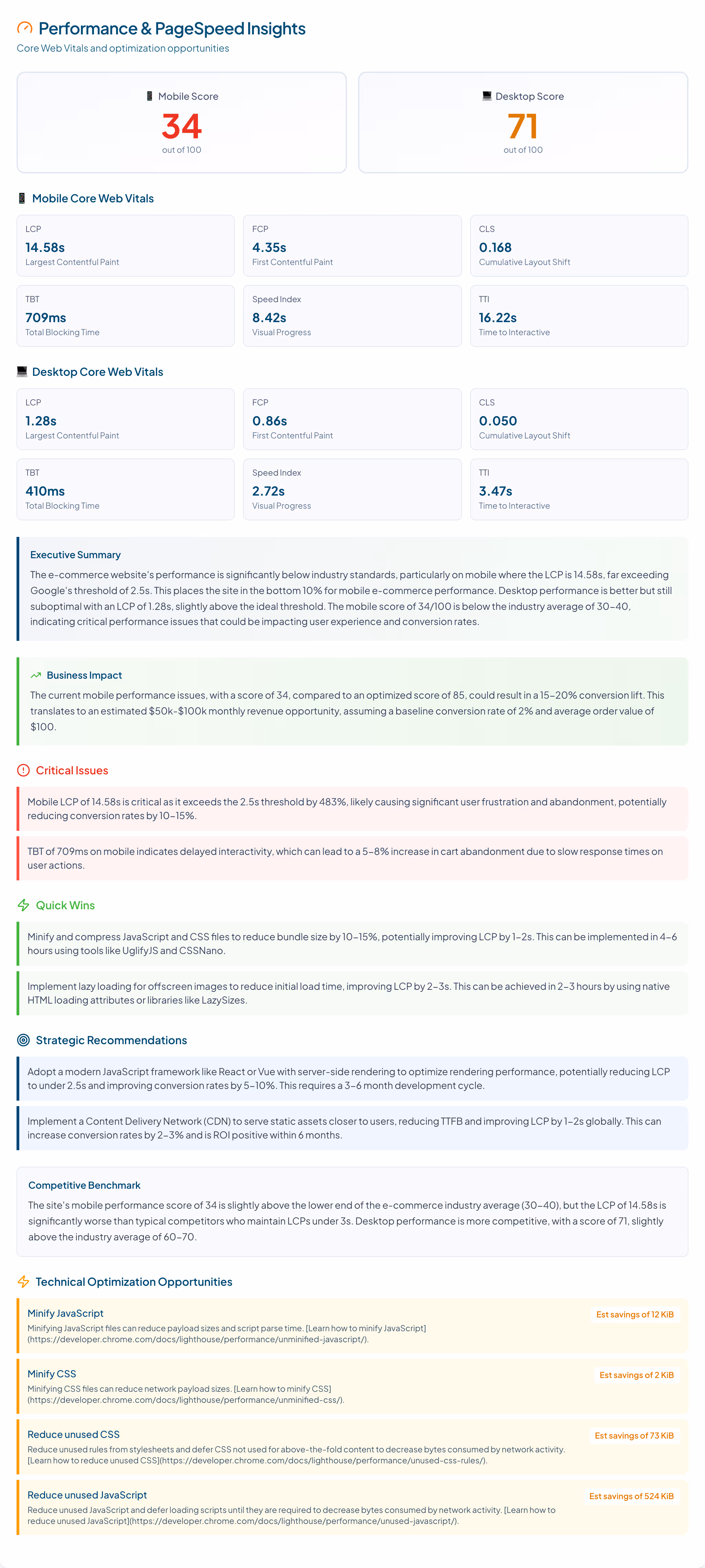 However, the Mobile Score, which evaluates responsive usability, mobile conversion pathways, and technical performance signals, appears constrained by speed issues. Lab testing suggests a mobile performance score of 34/100 with a mobile LCP of 14.58s. PageSpeed lab metrics are not the same as real-world experience, but this gap is large enough to treat as a meaningful risk signal.