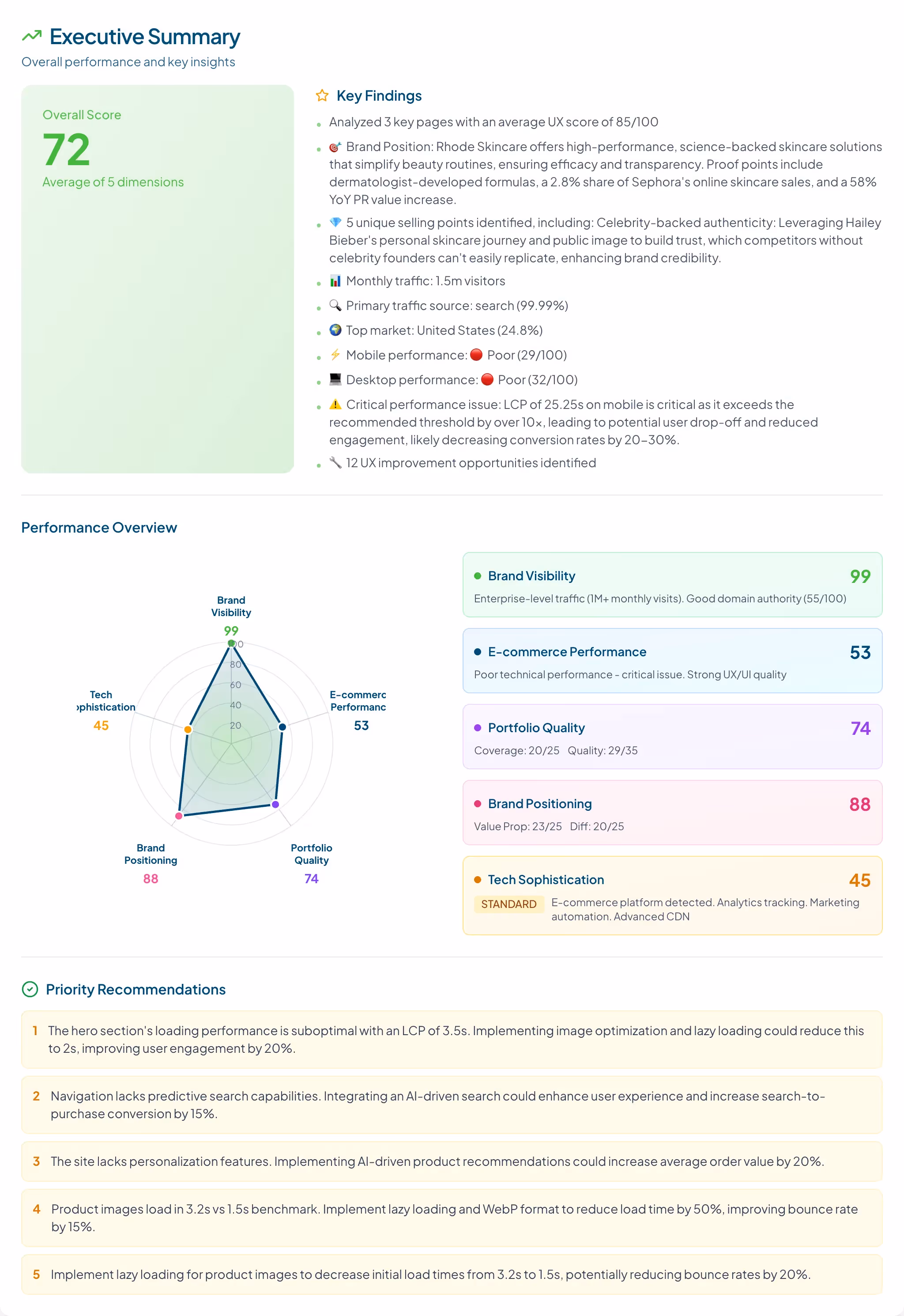Lab-based performance diagnostics flagged several issues that any growth or product team would want to prioritize: